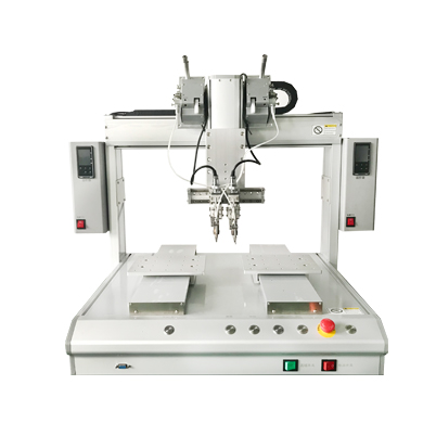 双头双Y轴自动焊锡机在三轴自动焊锡机的基础上增加了一个Y轴平台,双工作平台、双头发热模组,节约替换夹具时间焊接.